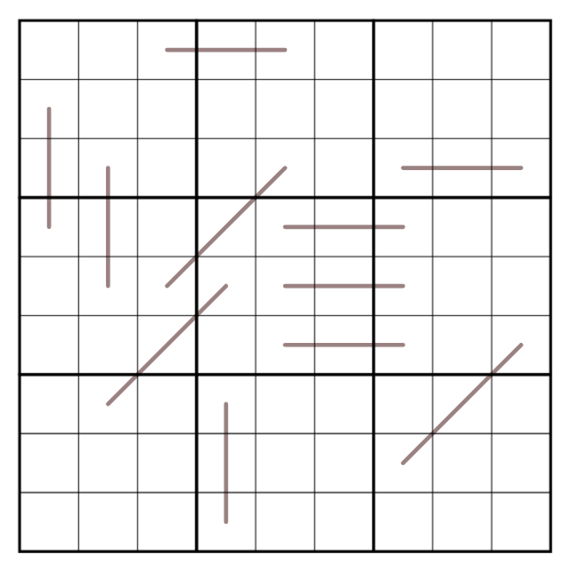 • X-triplets are formed by 3 digits on a straight line that sum to 10. Digits may repeat on an X triplet, if allowed by Sudoku