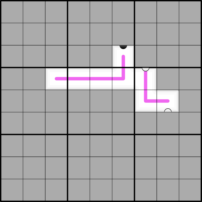 Notes for the limitations rule. The four circles connected to a gray line are not on a gray line, and may repeat on an gray arrow or gray between line if allowed by other rules. White Kropki dots are not circles.