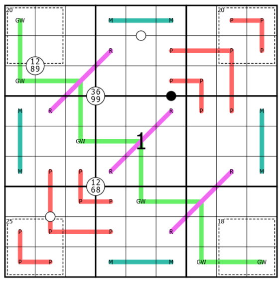 • Digits on pink renban lines must be consecutive, however not necessarily in order.