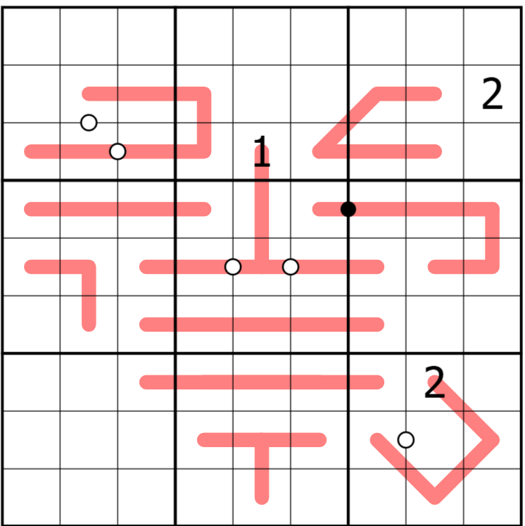 Kropki dots: Two cells seperated by a white dot are consecutive.