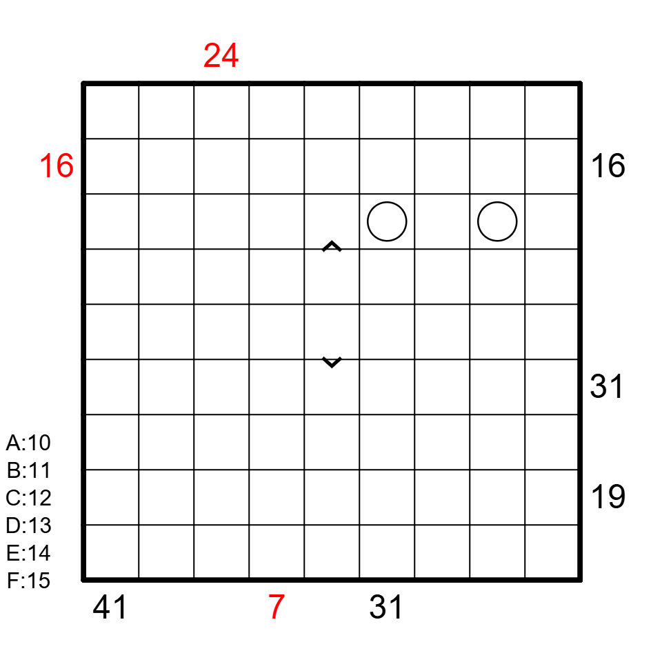 • Chaos X-Sums: Black and Red clues outside the grid indicate the sum of the first N cells in that row/column, where N is the value in the first cell seen from the direction of the clue. These N cells all belong to the same region, and the N+1th cell either belongs to a different region or is past the edge of the grid.