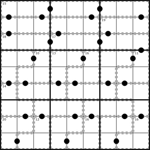 A nice and quick puzzle, greatly sped along by knowing that every box has exactly one center cell, no more and no fewer.