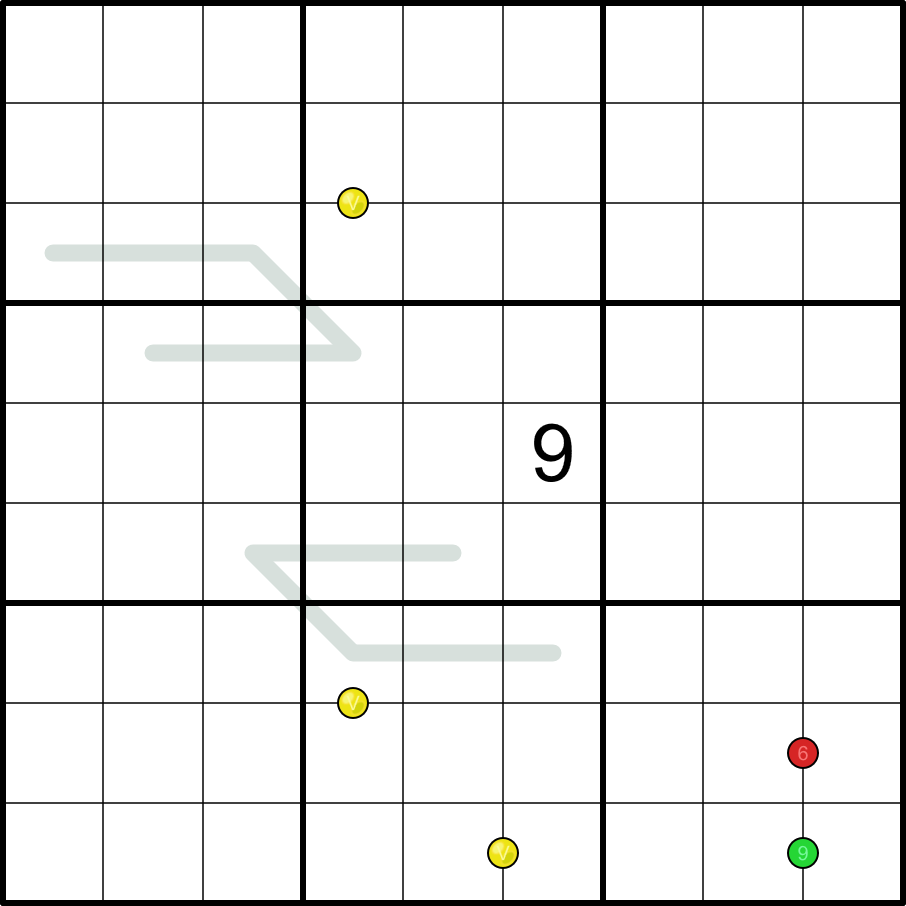 - Digits joined by a green dot sum to 9.