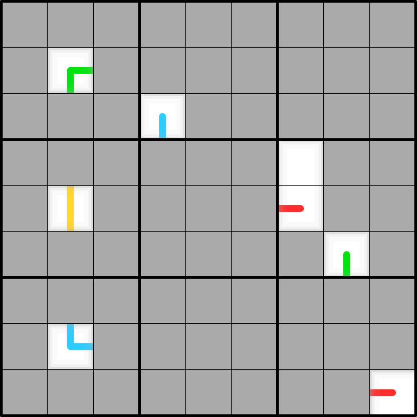 Each line has a distinct color. Lines do not branch or cross and only move orthogonally.