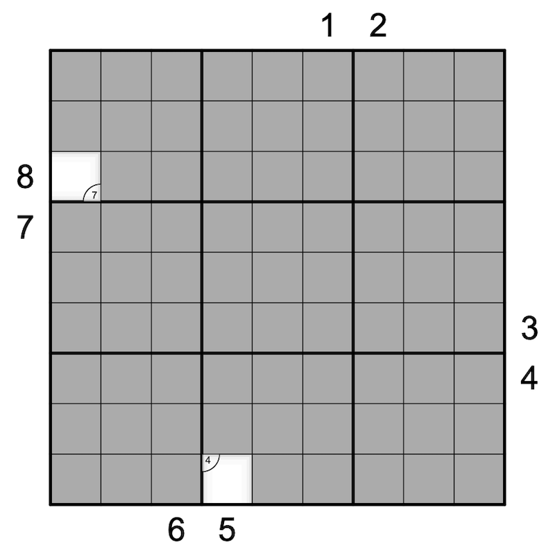 Numbered Rooms: Digits outside the grid indicate the digit contained in the cell X steps away from the clue, where X is the digit in the first seen cell.