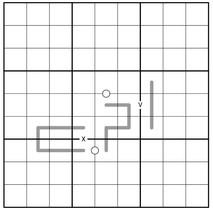 XV PAIRS: Cells separated by a "X" must sum to 10, and cells separated by a "V" must sum to 5. Not all XV pairs are given.