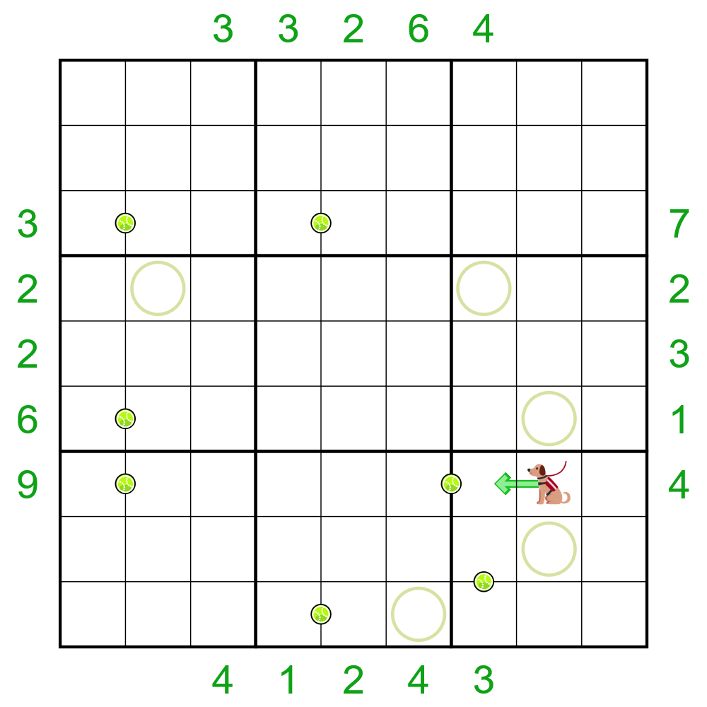 - The loop "starts" at the cell marked with the dog and is considered to be oriented in the direction indicated by the arrow (i.e. r7c7 and r7c8 are in the loop).
