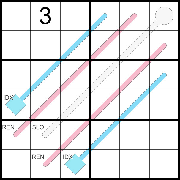[IDX] Index lines: On a blue line, the digit in the Nth position (starting from the diamond) indicates the position along the line where the digit N appears.