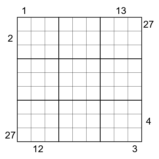 Shadow sums: A clue outside the grid gives the sum of all numbers in that row/column which are smaller than the number immediately before them, when reading from the direction of the clue.