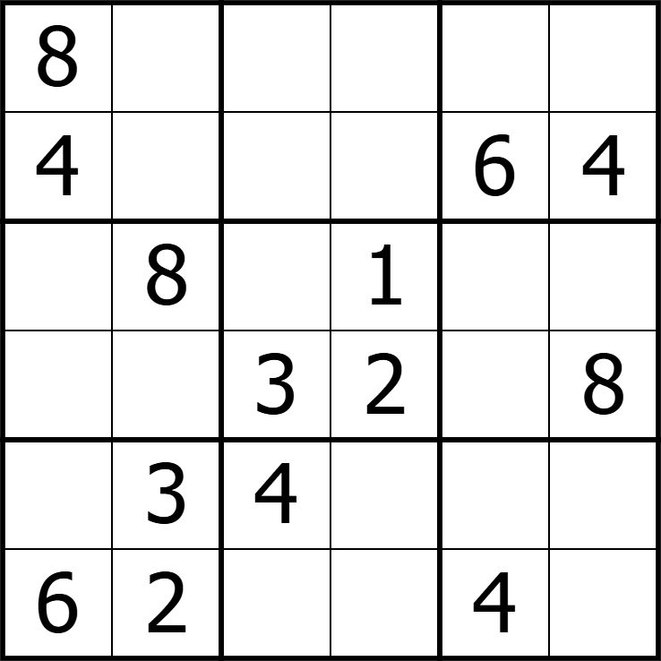 Place the digits 1-8. All digits n must appear n times in the grid. Digits cannot repeat in a region. Digits may appear a maximum of twice in every 3x3 quadrant. There must be a gap of three or more cells between every pair of identical digits.