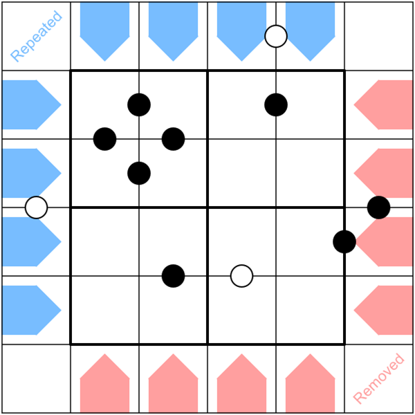 Kropki dots: A black dot between cells indicates cell values with a 2:1 ratio. A white dot between cells indicates cells with consecutive values. Not all dots are shown.