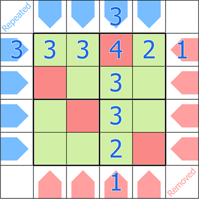 Each digit 1-4 appears exactly once in an impostor cell. The blue arrows is used to indicate the impostor digit in that row or column. Each digit 1-4 is removed from exactly one row, exactly one column and exactly one box. The red arrows is used to keep track of these. The blue and red arrows in the same row/column need to point to the same cell (the impostor).