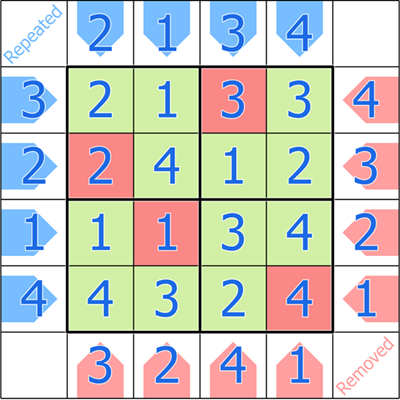 There are now repeated 3s in the impostor cells, as well as repeated digits in the blue row/column, and red row/column. The impostor cells must include the digits 1-4 once each, and the digit 1-4 must appear once each in the blue row/column, and red row/column.