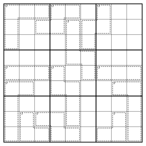 - Killer cages: Digits in a cage do not repeat and must sum to 17.