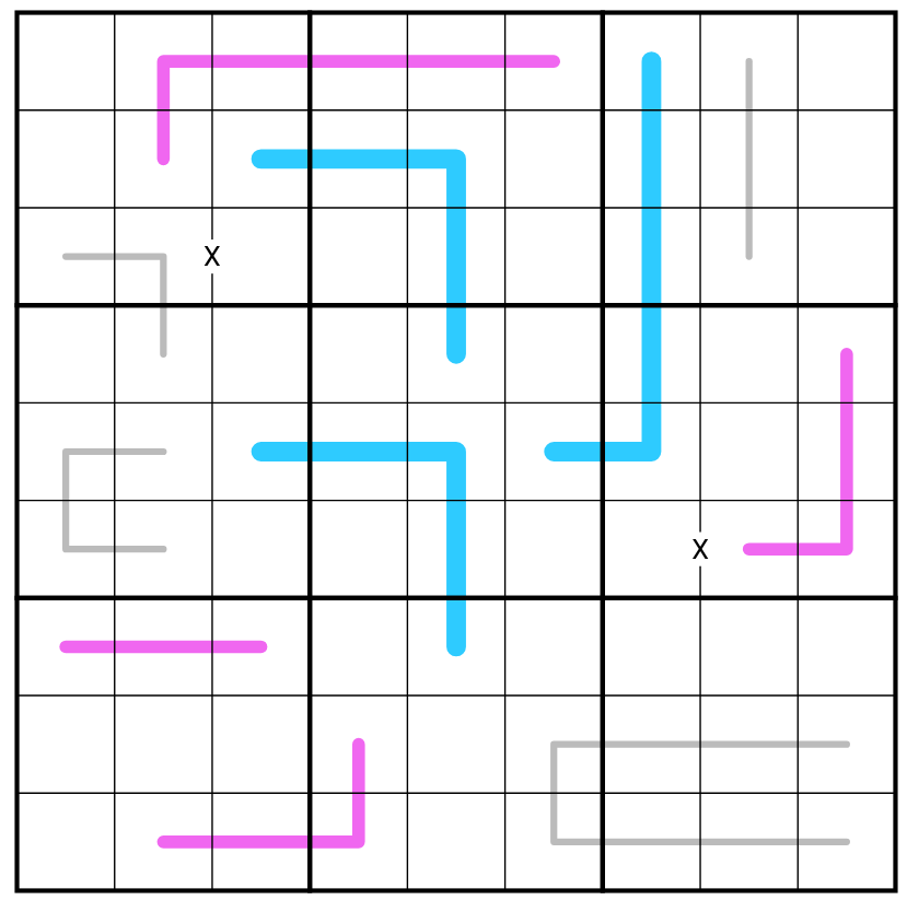 X-Pairs. Cells separated by a "X" must sum to 10. Not all X-pairs are given.