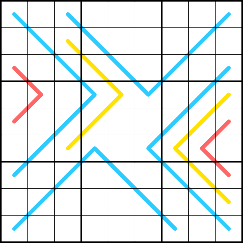 Box borders divide each blue line into segments with the same sum.