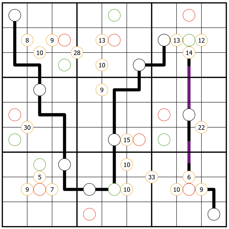 4. ◯ Orange Circles: Numbers in orange circles between cells indicate the sum of the digits in the cells the circle overlaps.