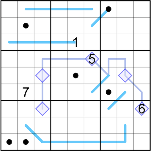 Blue lines are Region Sum lines wherein 3x3 box borders divide them into segments with the same sum.