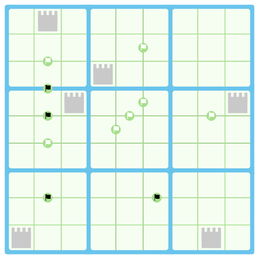 Very cool twist on a familiar rule. The castles were a great idea for restricting (what seems like) a very loose constraint.