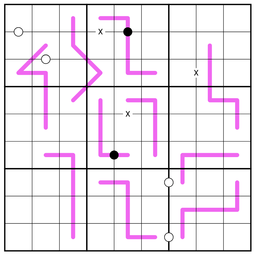 X-pairs. Cells separated by a "X" must sum to 10. Not all X-pairs are given.