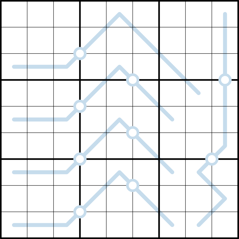 EQUAL SPLIT LINES: Dots split lines into segments with equal sums. In this puzzle, each line has a unique segment sum.