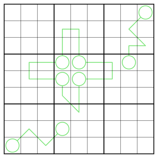 Global entropy: The low digits (1, 2, 3), middle digits (4, 5, 6) and high digits (7, 8, 9) are defined as three different groups. In the finished grid each 2x2 box has to contain at least one digit of each group.