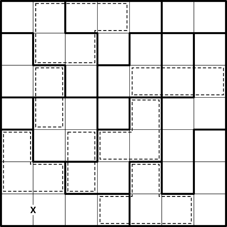 Place the digits 0-6 once in every row, column, and seven-cell region. Only one marked region has seven orthoganally connected cells. The six remaining regions are split into two orthogonally connected groups of cells (a 2 cell group paired with 5 cell group etc).
