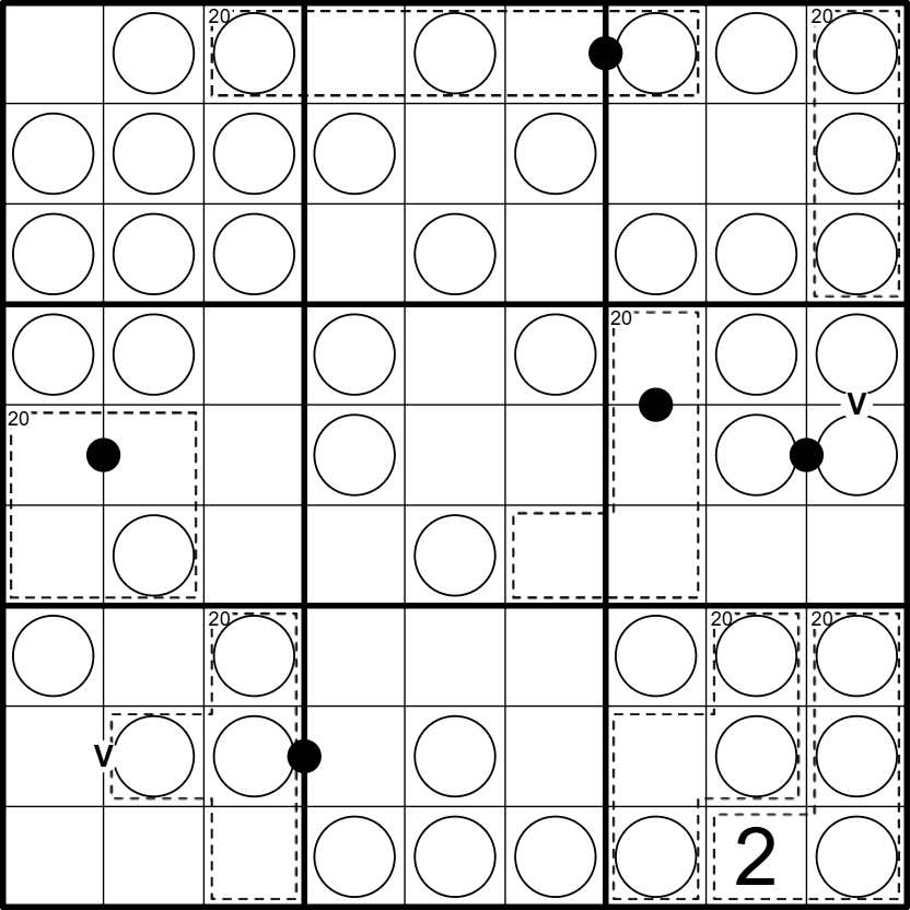 * Cages sum to the number in the upper left corner. Digits may repeat in a cage if allowed by Sudoku