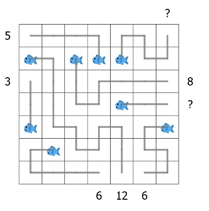 From each clue outside the grid, draw a path which begins in the nearest cell of the grid and then travels from cell to cell orthogonally until arriving at a fish. All empty cells must be used by a path. Paths may not cross themselves, each other, or fish. A number at the beginning of a path indicates how many cells in the grid the path occupies, including the cell with the fish.