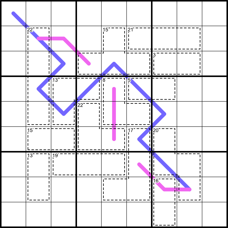 I suggest you clarify the rules a bit, for our color blind friends, it might be difficult to understand if the line stops at r8c8 or continues till r7c6 (it might look like the pink and blue lines are just one single line for them). Although you mentioned "12 digits", it's better to clarify the rule I suppose