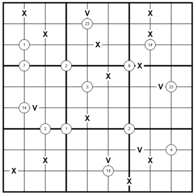 Quadruples: Digits in a Quadruple circle must be placed ONLY ONCE in one of the four cells touching that circle.