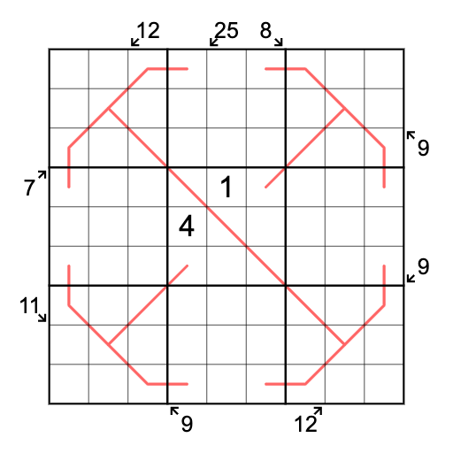 Diagonal Sums: Clues outside the grid are the sum of the digits along the indicated diagonal. Digits may repeat if allowed by other rules.