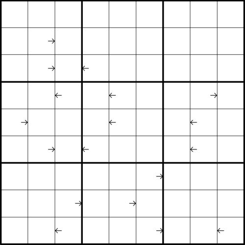 Rules: Normal Sudoku rules apply. A cell with an arrow is a “photon” with “energy” E given by the digit in the cell. The immediately neighboring cell pointed at by the arrow is the “lower state” of an “associated quantum system”. An associated quantum system is a pair of cells within one column that consists of a lower state, pointed at by a neighboring photon, and an upper state somewhere above the lower state. The “energies” L and U of the lower and upper states, respectively, are given by the entered digits. Each photon excites its associated quantum system; this means that the energy of the upper state is given by the sum of the energy of the lower state and the energy of the photon, i.e., U = L+E. In addition, the upper state must be located E cells above the lower state. A cell may act as several lower and/or upper states associated with different photons.