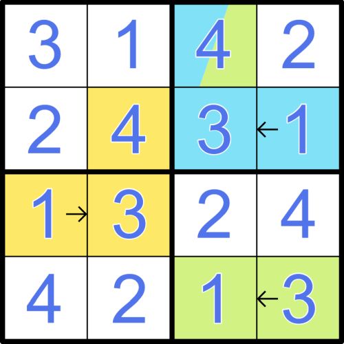 Example: The following image provides a fully solved example on a 4x4 grid. You may solve the example for yourself here on SudokuPad. The yellow cell in column 1 is a photon with energy 1 exciting the quantum system marked in yellow in column 2. The two photons in column 4 marked in blue and green excite two associated quantum systems in column 3 marked with corresponding colors. Note that the upper state is shared by the latter two quantum systems.
