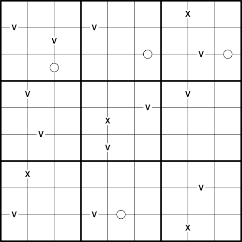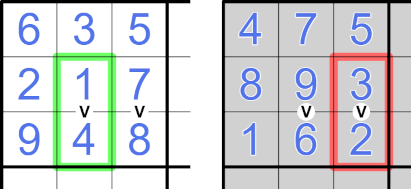 The image below shows an example of a partially solved grid and the corresponding shadow cells. For example, the digit 6 has a corresponding shadow cell whose value is 10-6=4. The V clue marked green is a normal clue, and the V clue marked red is a shadow clue, because it's only true for the shadow cells.