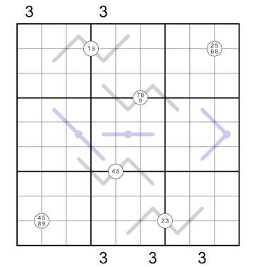 Zippers: On a purple line, pairs of digits equidistant from the center sum to the central digit of their line.
