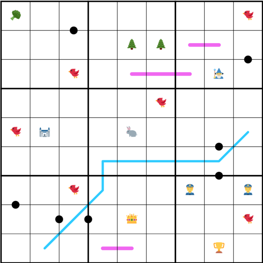 You must help the Knights of the Round table (who dance when they are able) find the holy grail! Draw their path, a line that travels orthogonally through the centre of some cells. This path must start with the knights (crown) and end at the grail (cup in box 9).