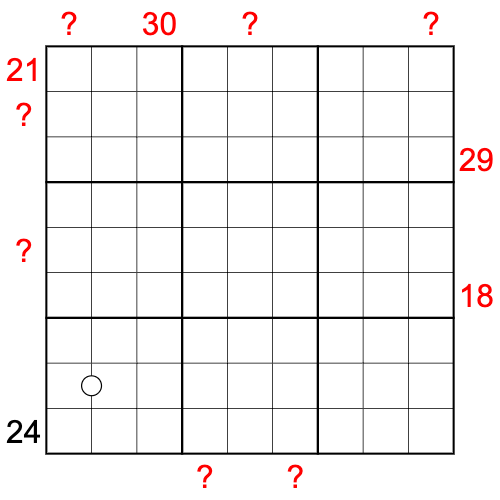 For my second puzzle, I tried experimenting with X-Sums and Sandwiches. In particular, I wanted to combine these two constraints. So I started creating a sudoku to see what such a puzzle would look like, and I found the result very interesting. It was a lot of fun to make and I hope solving will be fun as well. I think the puzzle is quite hard if you're unfamiliar with these constrains but I recommend you solving the two warm-ups before to fully comprehend the constraints. Once you know the tricks, the main puzzle is much easier to solve.