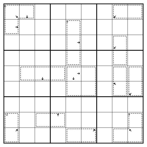 Cages: Digits in cages may not repeat and must sum to the number in the top left corner of the cage, if given.