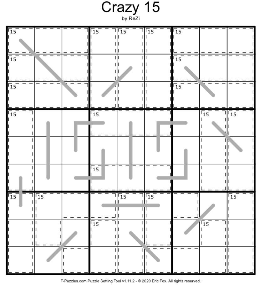 The Sum along each line and in each cage is 15. Normal Killer Sudoku rules apply: numbers do not repeat in a cage.