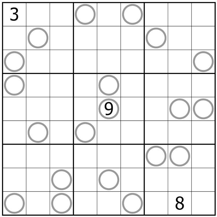 In this puzzle, circles mark cells where it is not possible to place a valid arrow bulb in the solved grid.