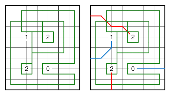 The solver is recommended to keep track of nesting values of non-clued vertices (as shown in the right image), although they are not required for the solution.