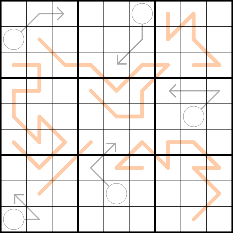 Entropic Lines: Every three consecutive cells along a peach entropic line must contain a low digit (1, 2, 3), middle digit (4, 5, 6) and high digit (7, 8, 9).