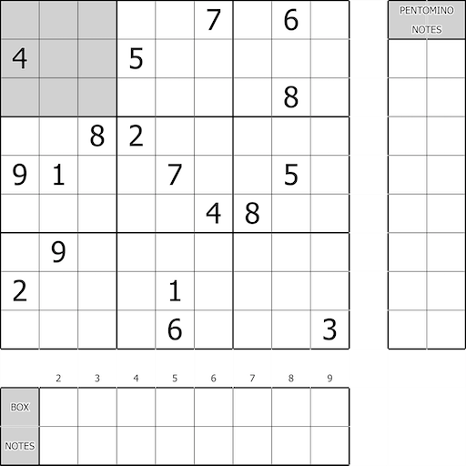 Normal sudoku rules apply. Place a pentomino (ie: an orthogonally connected set of 5 cells) within each of the non-shaded sudoku boxes such that: