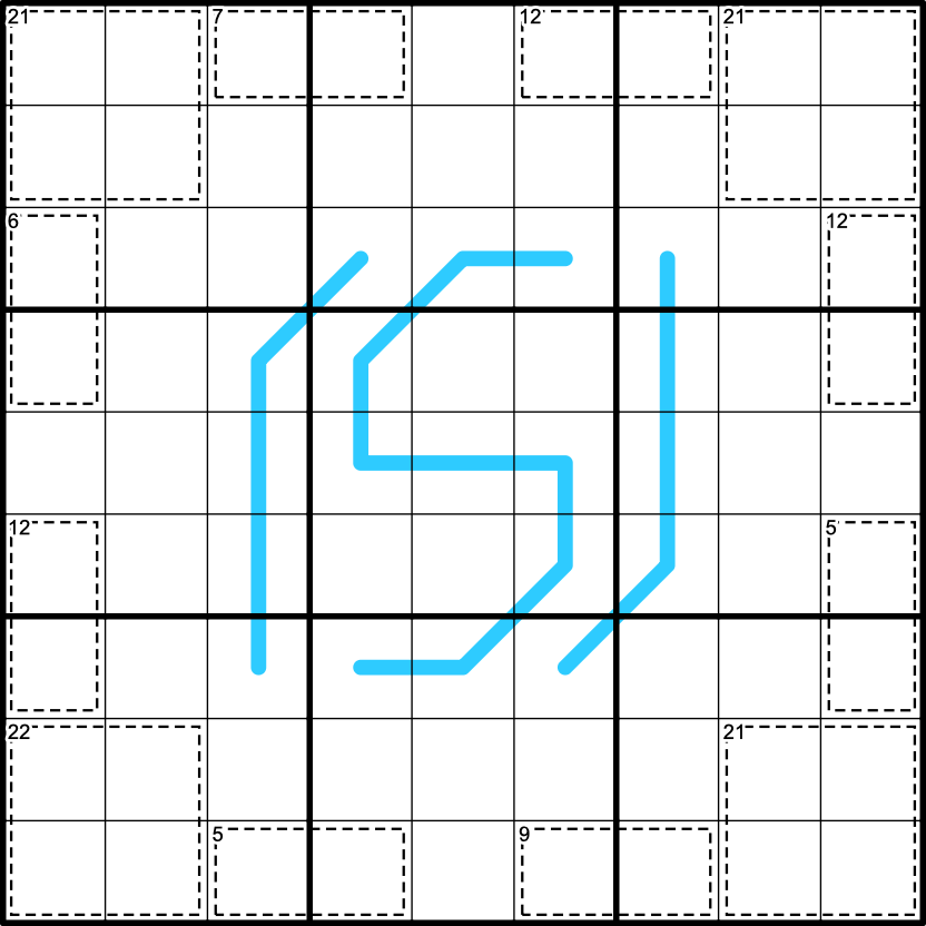Region Sum Lines: Along a line, each blue line segment within a different 3x3 box must sum to the same total. The sum may be different for different lines.
