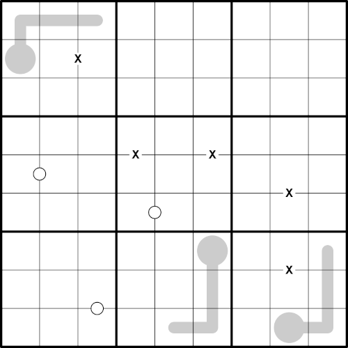 • Cells connected by an X must sum to 10. Digits connected by a white dot are consecutive. Not all Xs and dots are given.