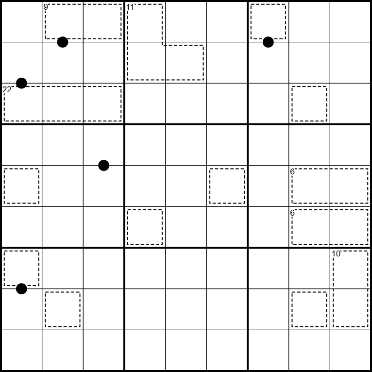Cell connected by an black dot must be in a 1:2 ratio. not all black dots are necessary given.