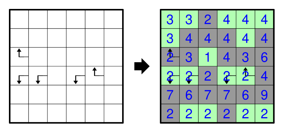 - Slingshots: If a bent arrow is present in a cell, the digit in the cell the arrow comes from also appears in the direction of the arrow at a distance of N cells, where N is the number in the arrow's cell. (The cell at a distance of N cells is called the slung cell.)