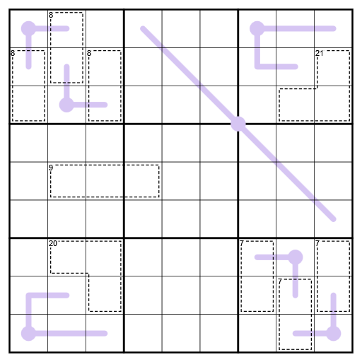 - Normal sudoku rules apply, i.e. each row, column, and 3x3 region has to contain the digits from 1 to 9 once each.