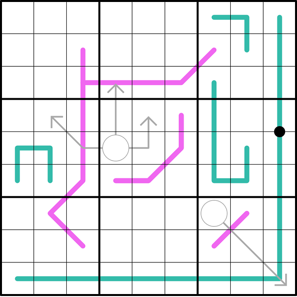 Arrows: the sum of the values along an arrow is equal to the value in the connected circle.